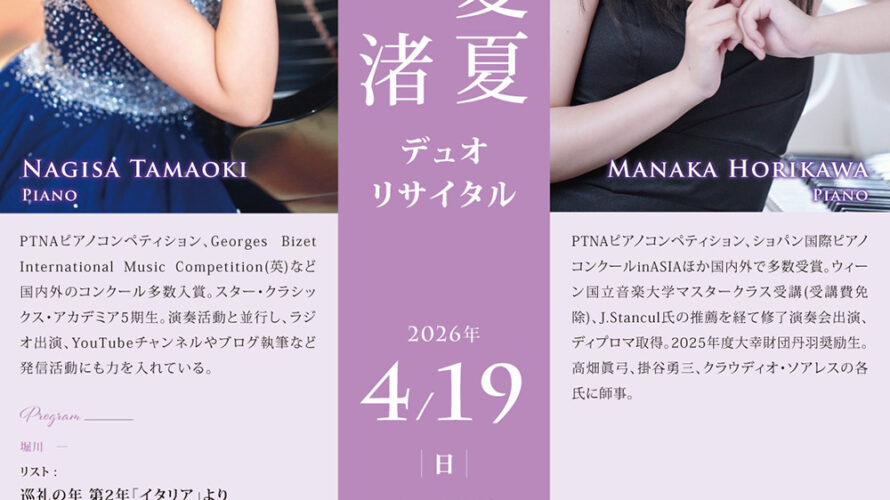 2026年4月19日(日)に日暮里サニーホール・コンサートサロンで玉置渚&堀川愛夏 デュオリサイタルを開催いたします。リサイタルに向けて玉置渚さん、堀川愛夏さんにインタビューいたしましたので、ご覧ください。 インタビュー 今回のリサイタルに向けての抱負を教えてください。 堀川:このような素晴らしい機会をいただき、大変嬉しく思っております。これまで数々の演奏会を共にしてきた玉置と、今回も同じ舞台に立 […]